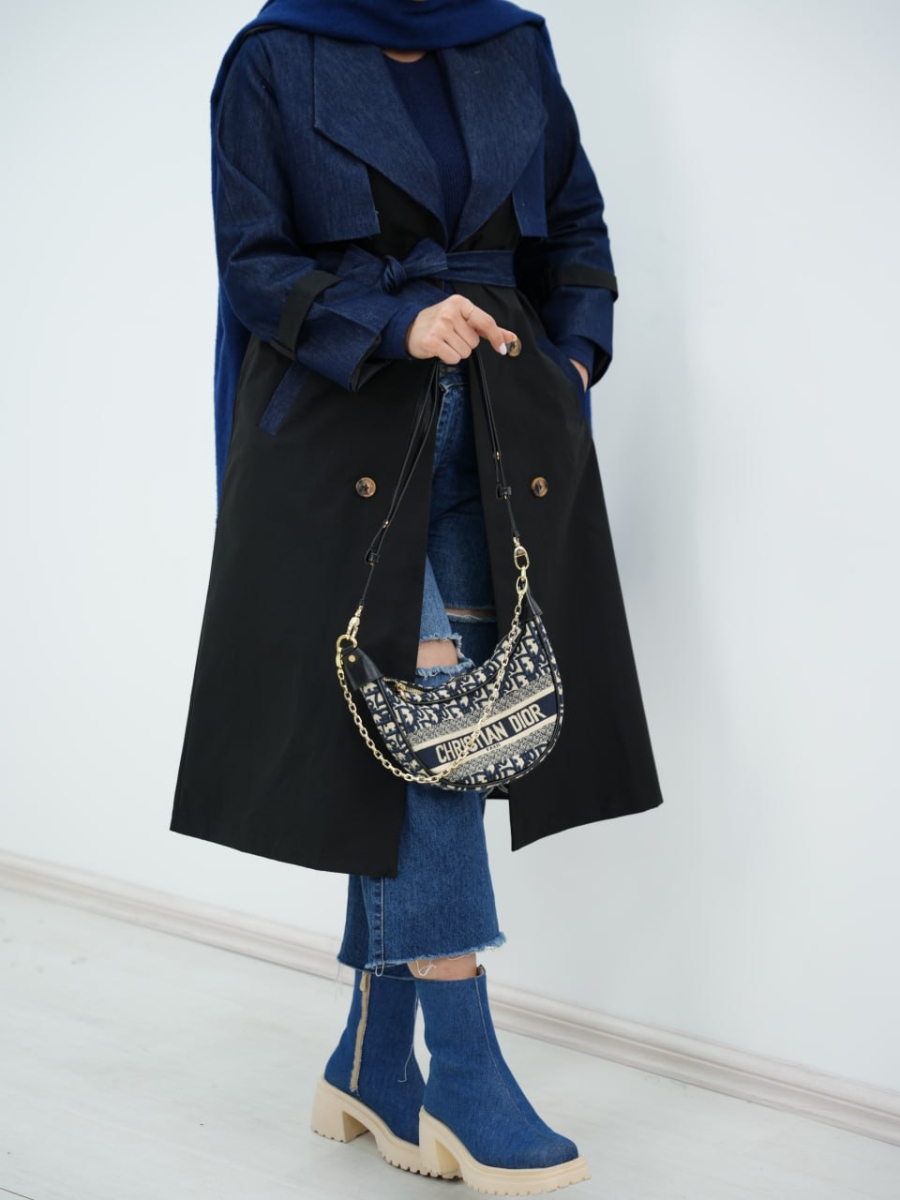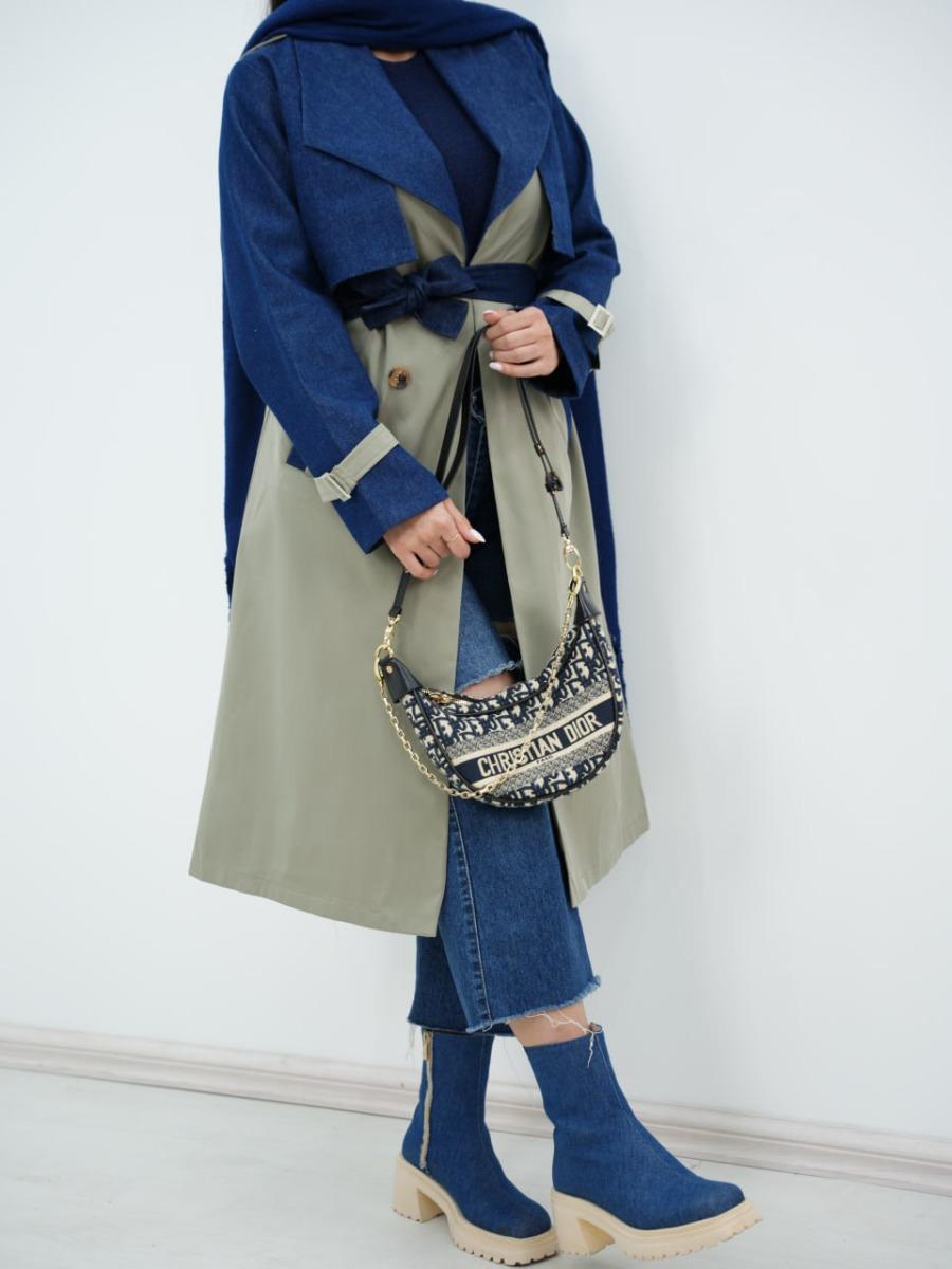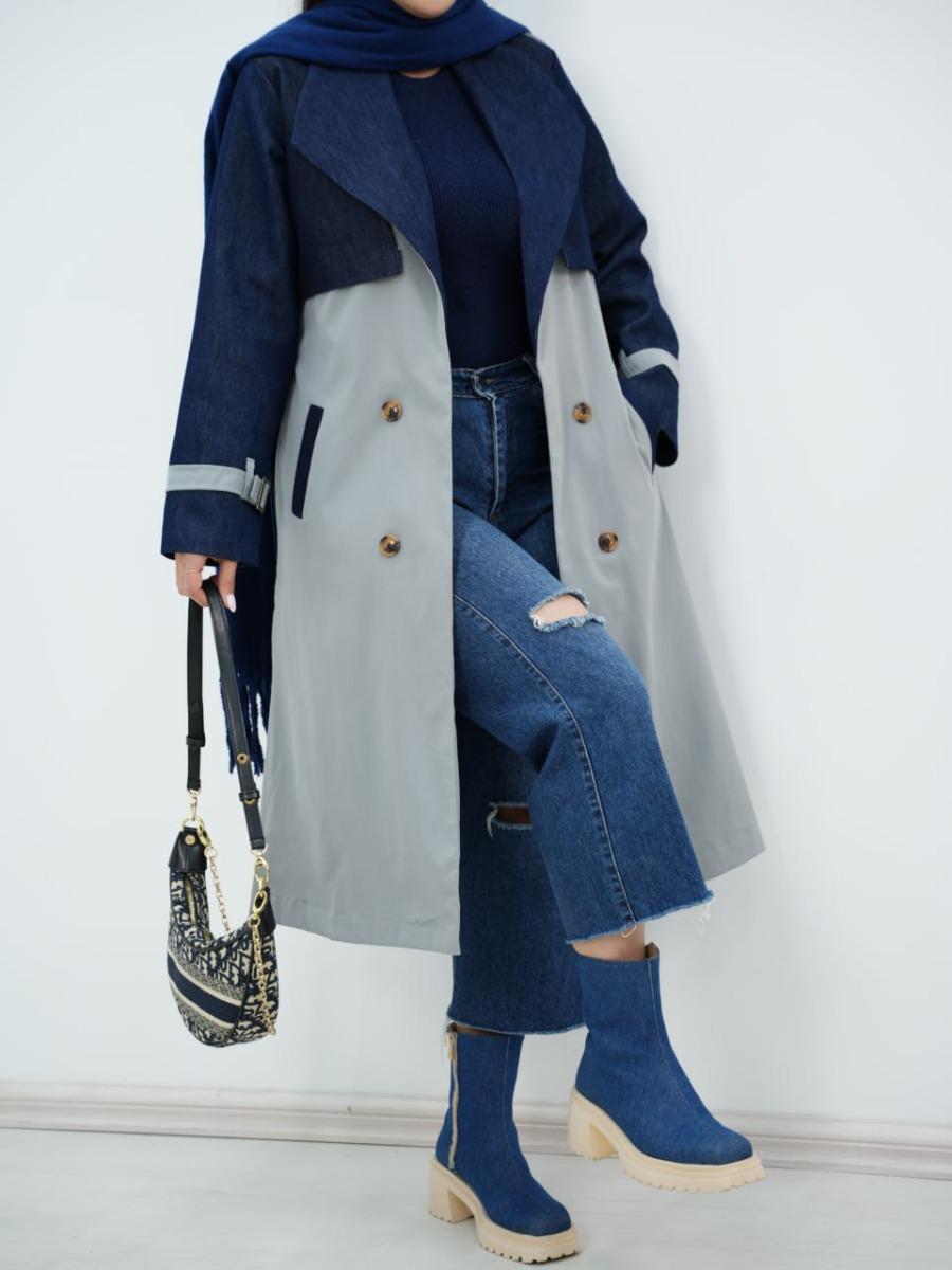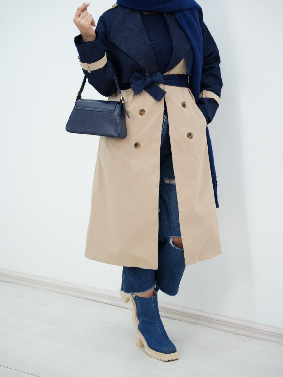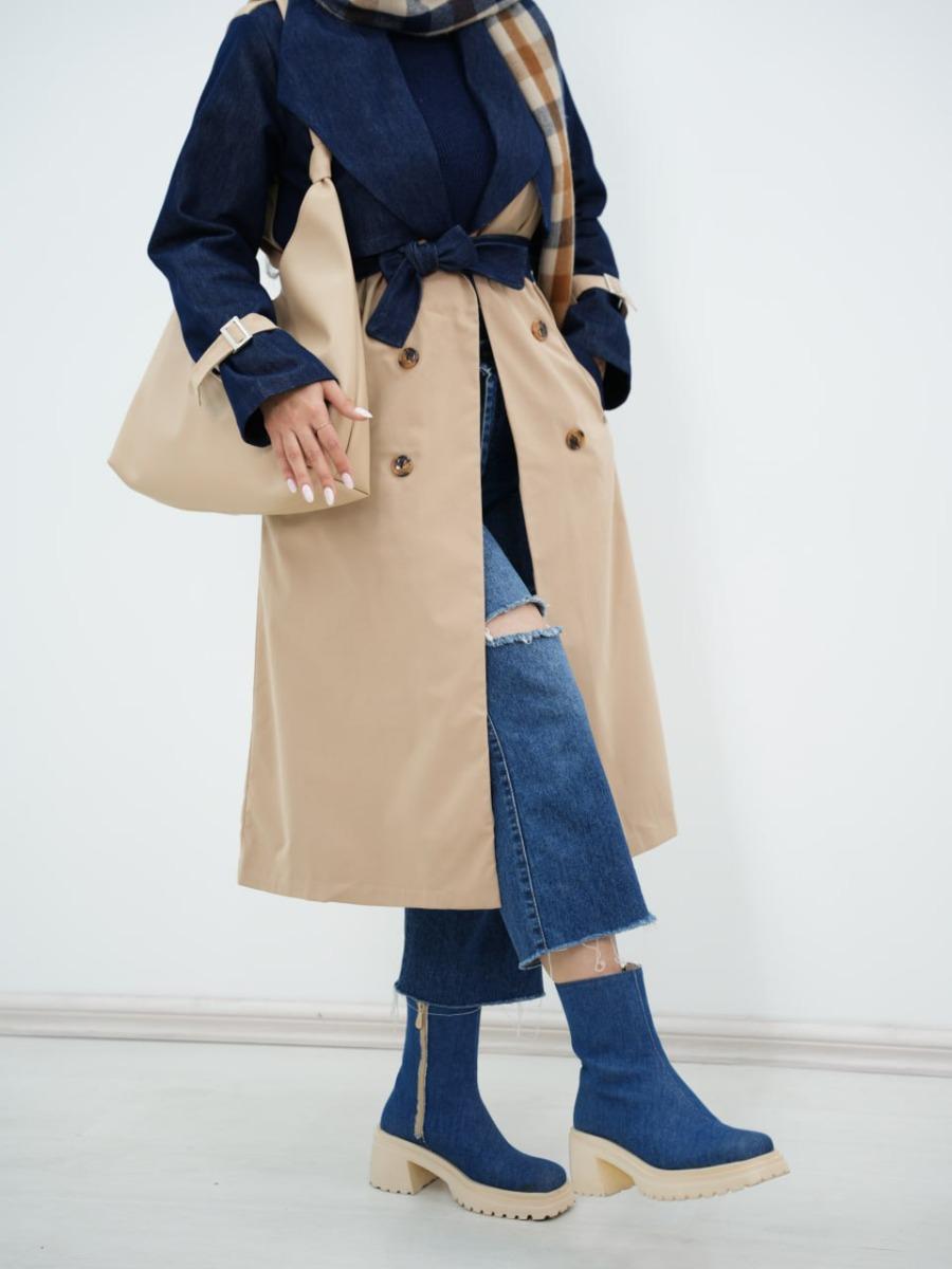 بارونی بلند ترکیبی جین کمردار مهوا کد6479