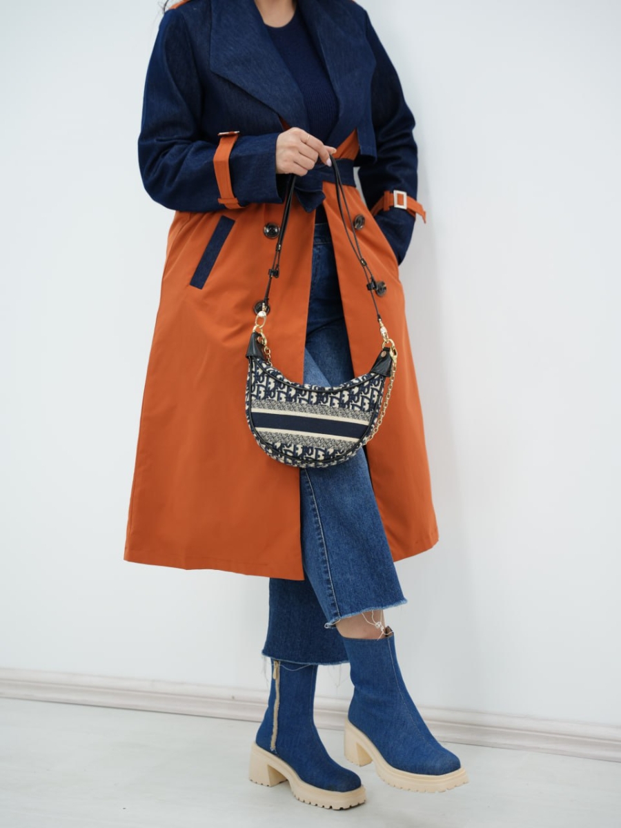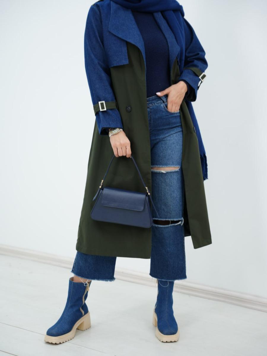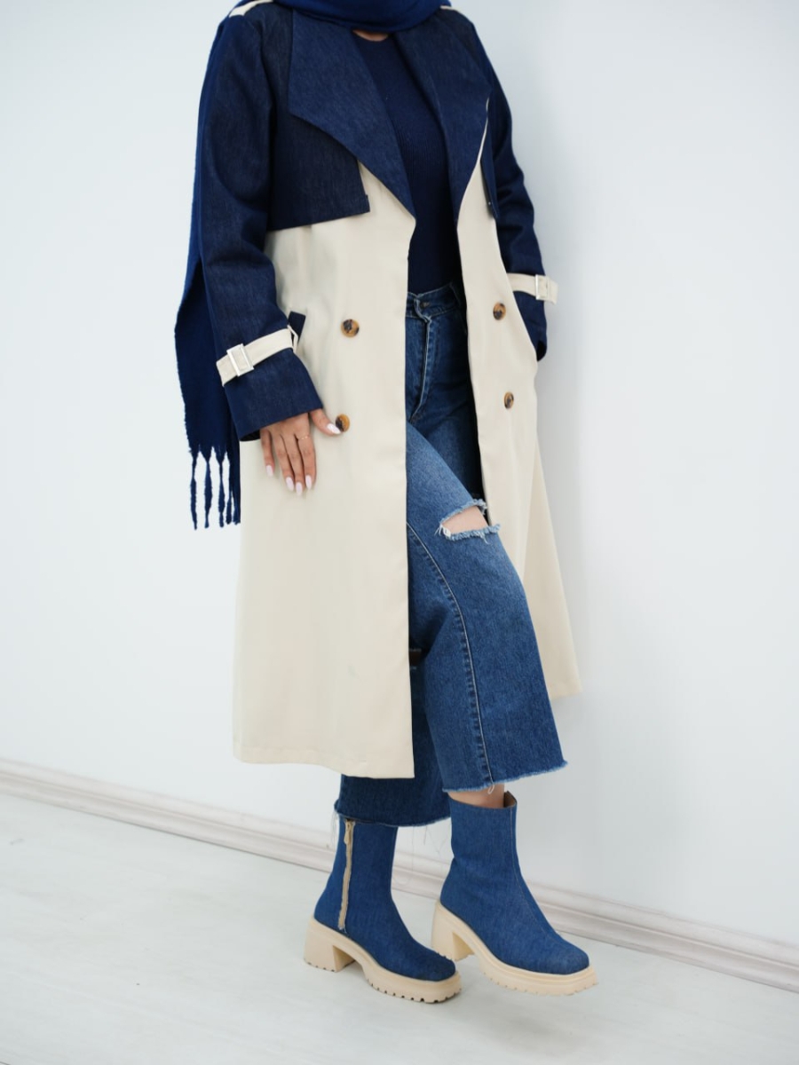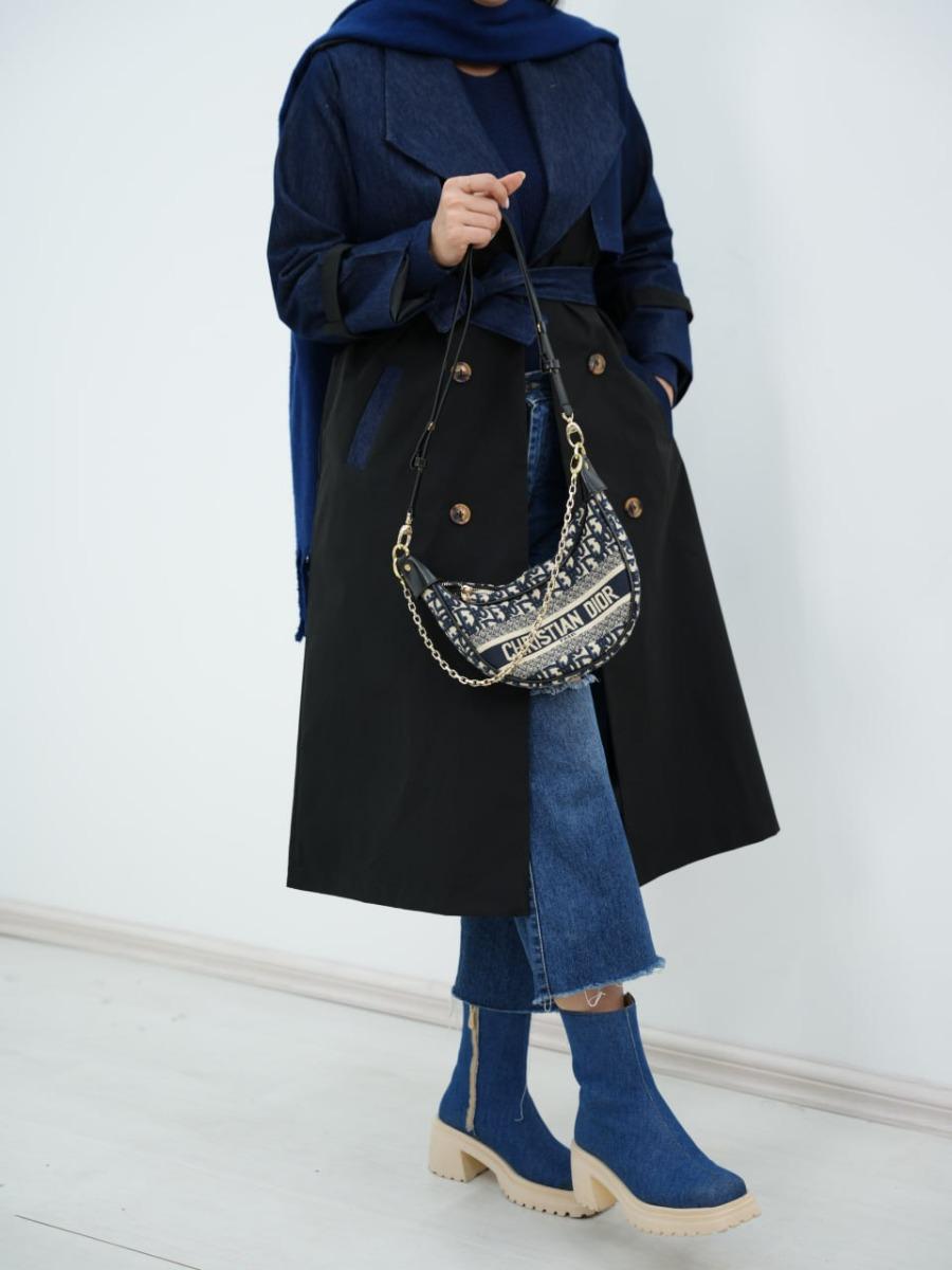 بارونی بلند ترکیبی جین کمردار مهوا کد6479